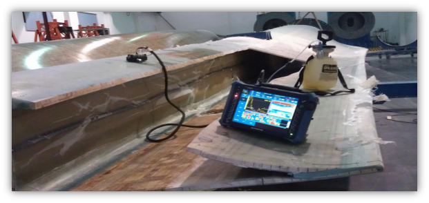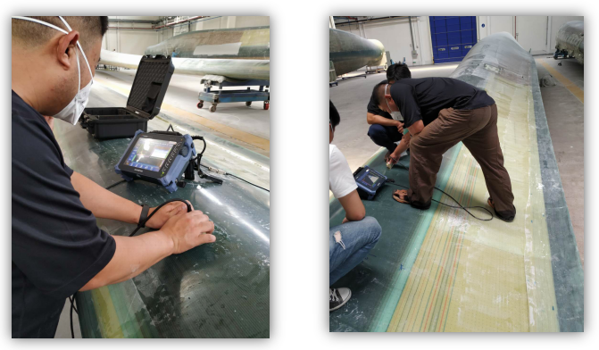 對于傳統的UT檢測來說,玻璃纖維結構穿透性非常差,需要極低頻率的探頭才能夠穿透工件,地面的不平整和支撐梁的信號干擾,對常規超聲檢測影響非常大;