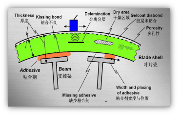 在風電葉片檢測中,內部分層,脫粘等缺陷是影響其壽命的重要因素,因而PT這樣的表面檢測手段使用有限,而且這類缺陷,RT對其反應也極其不敏感;