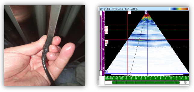 我們對有圖所示螺栓工件進行檢測,使用扇掃描的檢測結果如下,螺栓中預埋的裂紋類缺陷清晰可見。
