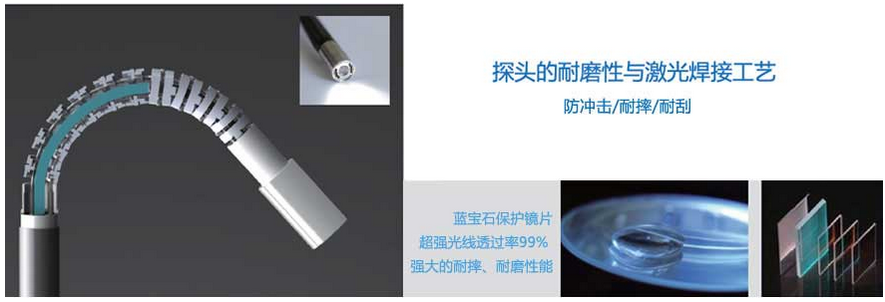 C50電控高清工業內窺鏡、插入管的探頭部分使用具有高度耐磨性能的鈦合金,鈦合金所具有的耐磨強度是普通不銹鋼的100倍;為進一步保護鈦合金探頭,采用了藍寶石保護鏡片,它的強度是普通石英石鏡片的8倍,鋼化玻璃的20倍,提升防沖擊、耐摔、耐刮性能,有效避免被檢設備的二次破壞。