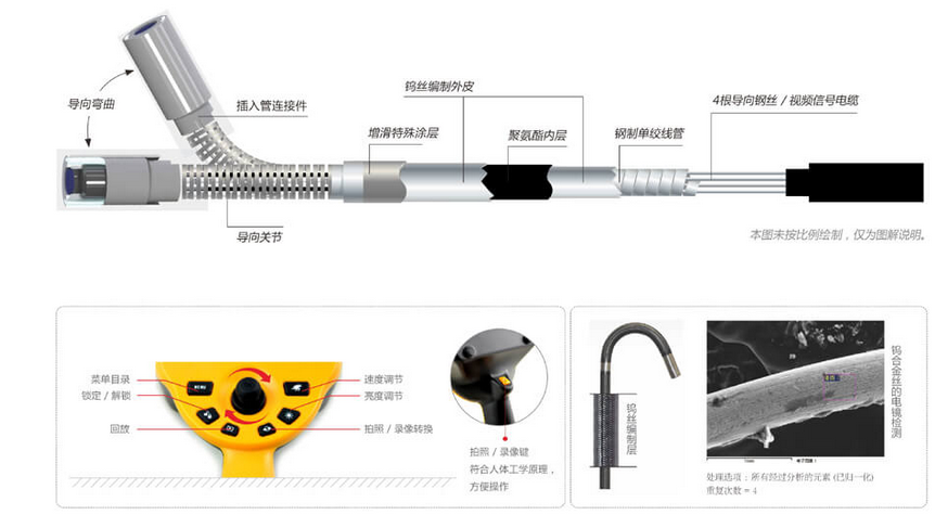 C50電控高清工業內窺鏡運用長距離信號傳輸及導向傳動技術,支持插入管7米,并且轉角可達120°,這一技術突破可以充分運用在管道、集箱或大型設備中。