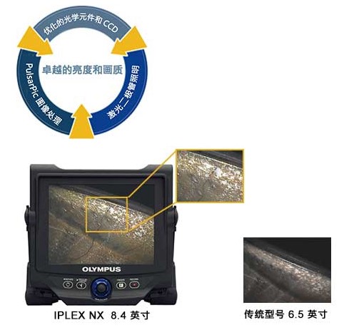 采用IPLEX NX觀察目標區域比以前更清晰。三種增強技術 – 改善的高分辨率CCD技術、先進的激光二極管照明技術和新型的PulsarPic處理器 – 提供了的畫質,亮度是傳統工業視頻內窺鏡的四倍。即使是大而寬的標本也能照亮檢查目標。