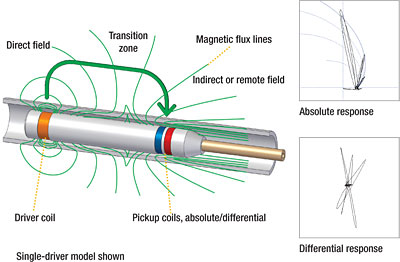 l 兩個線圈受電流激勵后在線圈周圍產生磁場。磁場穿過管件材料,在材料中產生相反的交流電。這些電流被稱作渦流。